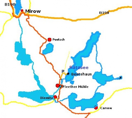 Von der Autobahnabfahrt Röbel (A19) auf die B198 in Richtung Mirow, Neustrelitz fahren, (ACHTUNG BLITZER) an der Ampel an der Schleuse Mirow geradeaus (nicht über die Schleuse), an der Ampelkreuzung Ortsmitte Mirow (rechts Sparkasse), nach rechts in Richtung Diemitz abbiegen, über die alten Bahnschienen, durch Peetsch die Hauptstr. rechts weiter, danach nach ca.3 km vor einer großen Rechtskurve (kurz vor der Fleether Mühle), scharf nach links den Schotterweg hineinfahren...weiter siehe 1B
